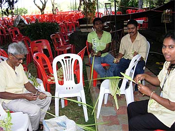 A group of Mster Course students making toranums out of coconut leaves for decorations.