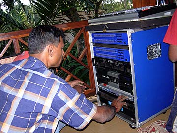Kumaren Moorooven is taking care of the PA system. He is adjusting his equipment. Powerful speakers have been installed in strategic spots.