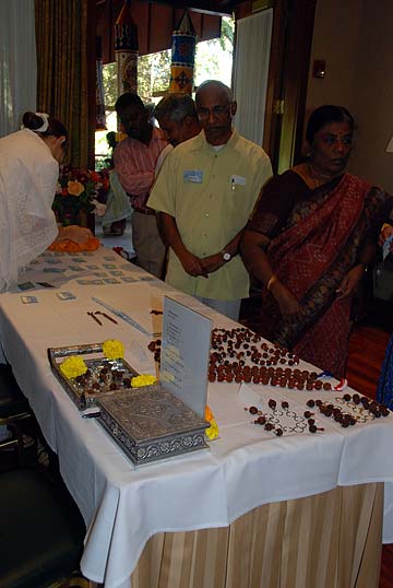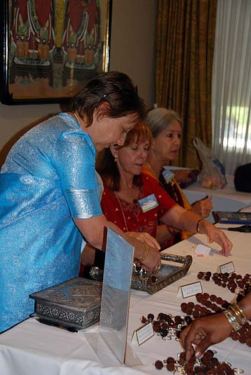 Devotees have set up a table of rudraksha malas for sale that were made in Kauai.