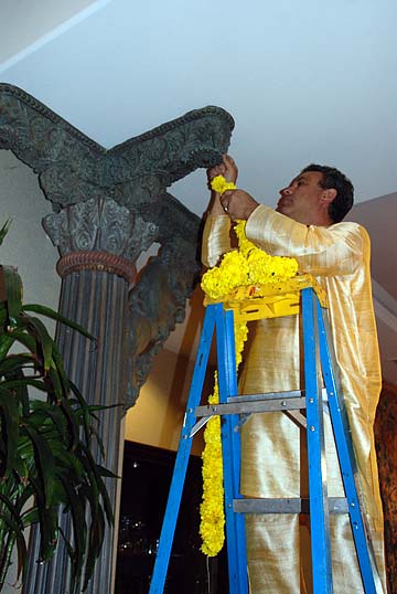 Getting ready for the big event. Easvan Param hangs a giant marigold garland.