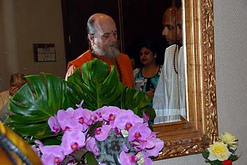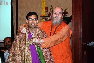 Bodhinatha and Sadhaka Dandapani go over a few things before the program begins.