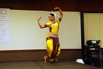 The final performer of the day, Nafeesa Mahmoud, enticed all with a spiritual Odissi dance. Nafeesa studies with Guru Sri Vishnu Tattva Das. She spent two summers studying at the Odissi Research Center with Guru Kum Kum Mohanty in Bhubaneshwar, Orissa and at the Smitalay Dance Academy with Guru Jhelum Paranjape in Mumbai. Nafeesa is a biology student at the University of California Davis.