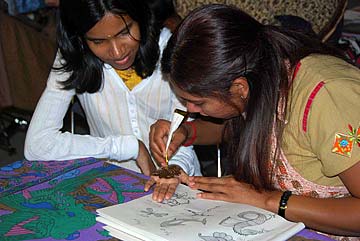 Deepa Param decorates Gowri Shankara's hand with traditional mehendi.