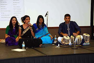 A college group, Tharangana, comprised of University of California Davis students, ( left to right ) Tina Mann, Anu Ranganathan, Sangeetha Ramalingam and Abhijit Kalavapudi,singing classical Hindu songs.