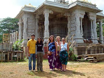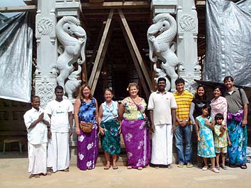 Posing in front of the Iraivan Temple entrance -Left to Right(Silpis) Chelliaya and Pandi; Charlene Oakes from Alaska who (guess what) ran into her neighbors who are old friends outside the temple door this morning! The Dandapanis are longtime devotees here, also on pilgrimage from Alaska (not shown in this photo).