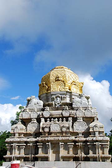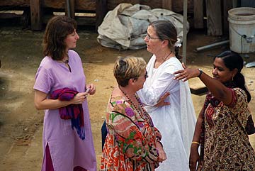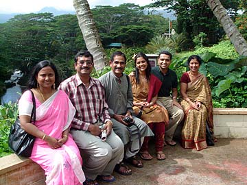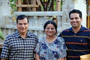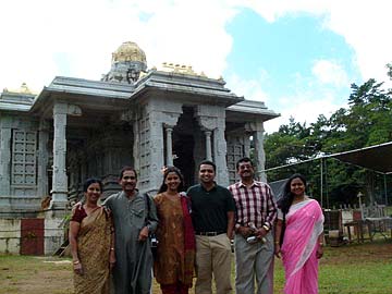 left to right: Annapur and Anusuya Sivakumar who is a microbiologist. Their daughter, Deepti and son-in-law, both physicians, all originally from outside Bangalore and now living in Libertyville, IL. All attend the Chicago temple. The whole family made the pilgrimage to celebrate Annapur's 60th birthday. On the far right is Satya and Nanda Dornadula from Fremont, CA where there is a large Hindu community.