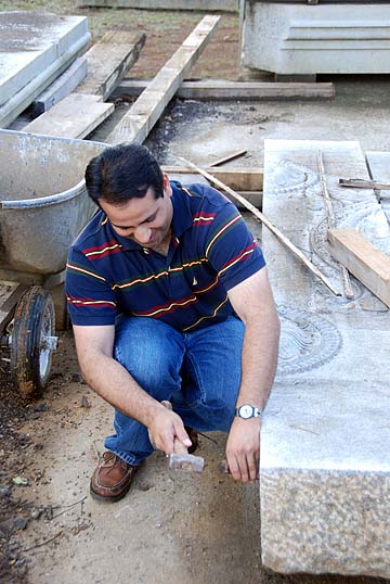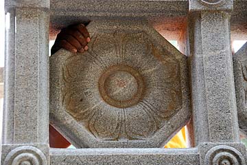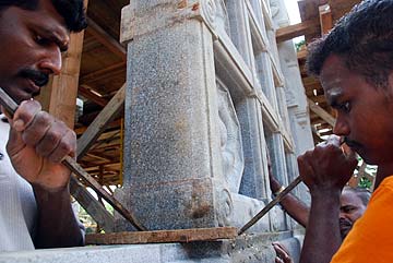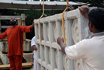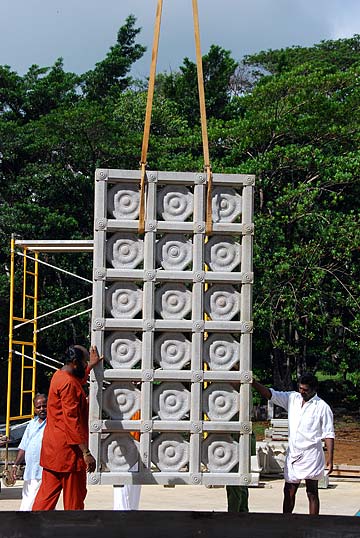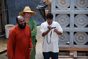 More guests arrived today and were blessed to see the Jalakam stone windows in place each side of the Yallis. Here they pose for a photo with our very dedicated and gifted silpis.