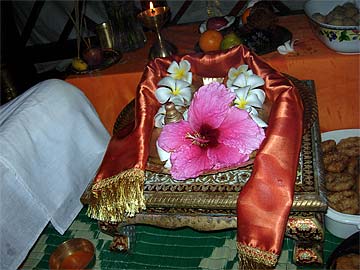 Arati to the Holy sandals while everyone chants the Guru Mantra...