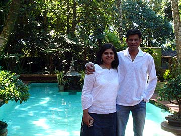 Pavan and Vasudha beside the Kadavul Temple pool.