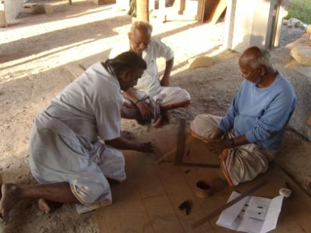 Chidambaram Sthapati--our Bangaluru carving site Sthapati and Tangavelu Asari--senior ornamentation supervisor/carver are with him. These two experienced men will transfer this drawing and supervise the carving done by the silpis