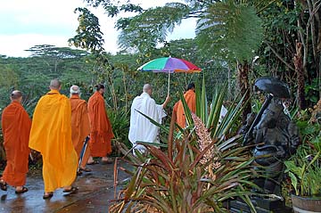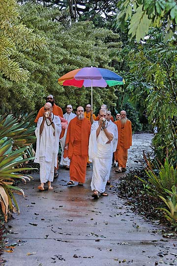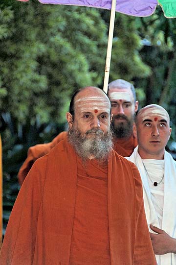 The major festival of Moksha Ritau is Mahashivaratri. It is at Kauai Aadheenam, as are all other gatherings, not a public event but a private one, due to the special sacredness of this sanctuary and its Iraivan moksha koyil. Church members, Academy students and special guests by invitation are all who attend. This and all other gatherings at the Aadheenam are restricted in size in keeping with a covenant with the county of Kauai in respect to the surrounding residential area. From December 21-25, the Pancha Ganapati festival is enjoyed in Church family homes worldwide, and the resulting joy and peace is felt even by strangers. During this holiday season, in years when the need is felt, an open house is held at Kauai's Hindu Monastery to which friends and neighbors are invited. We do this to express goodwill and appreciation for their kindnesses throughout the year. Satguru Jayanti is always celebrated at Kauai Aadheenam and wherever the guru chooses to be on that day. All shishyas gather to participate. Often, if he is outside the US, it will be conducted in his presence as a grand public event. The Aadheenam realms of this season are: 1) San Marga Iraivan Temple, a hand-carved, white-granite edifice seated upon a lava-rock plinth, golden tower shining in a rainbowed sky; 2) Tamil Nayanar Neri, the 1,300-foot-long path that winds around ponds, banyan trees, tropical plants in seven distinct botanical habitats, with seven shrines to the great Saiva saints of South India, and 3) Kauai Aadheenam central, with its offices, publications facilities, kitchen, library, workshops, monks' quarters, aviaries and cloistered gardens.