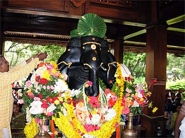 Meanwhile a massive flow of devotees has queued up at the small Ganesha Mandapam ....