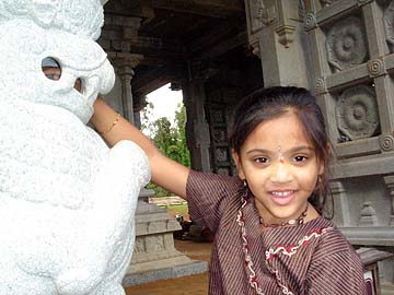 Five year old Anisha Sonti is delighted to discover the round granite ball in the lion's mouth during her visit to the Iraivan Temple.