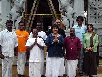 Our temple silpis pose in front of the entrance to the Iraivan Temple with todays visitors -