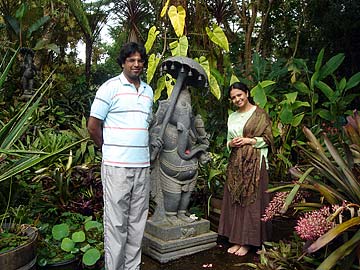 Prasad and Gargi with the very beautiful handcarved umbrella Ganesha on the path to the Iraivan Temple.