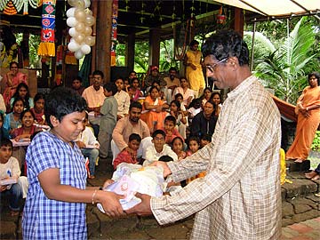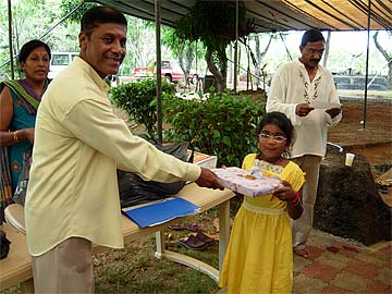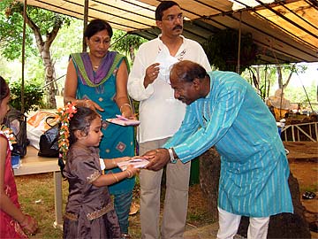 Gifts were distributed to everyone. Here is Kulapati Siven Koothan offering a gift to a very young participant.