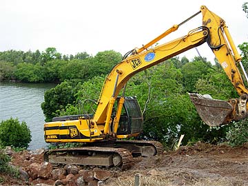 A JCB has been hired to clear the area leading down the river where concrete steps will be constructed in view of the Narmada Sivalingum Project.