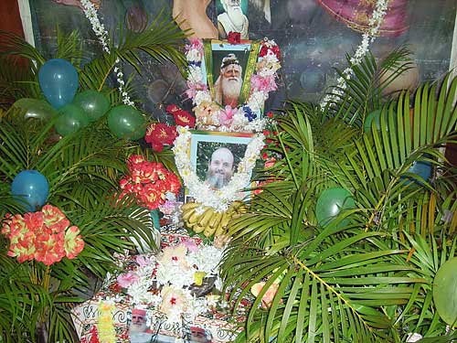 The sannyasin at the altar is doing arati for Gurudeva to bless the noonday meal.