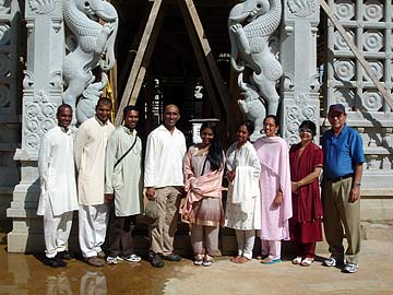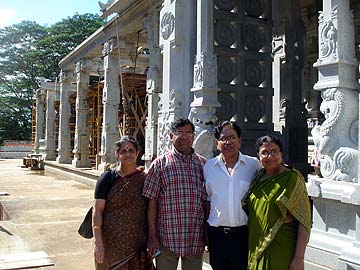Here are Shankar Planjery and his wife Rajyalakshmi with Shankar's friend of 30 years, Manikya Rao and his wife Radha in front of the east side lion pillars of the Iraivan Temple.