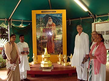 Our guests pose In front of one of four large painting of Gurudeva by the great Indian artist Indra Sharma. Directly in front is the very sacred Kalasa stone that will be placed on top of the lotus of the Iraivan Temple Capstone during the Maha Kumbha abhishekam. And on either side of the stone one can glimpse some of the gilded bronze Navaghrahas which will one day have a special shrine near Iraivan.