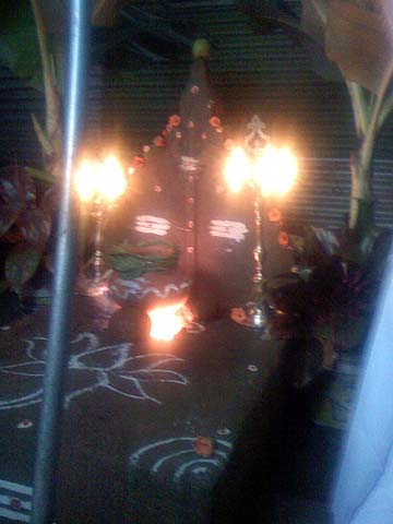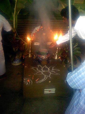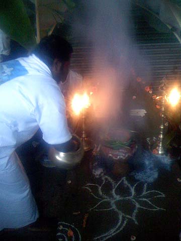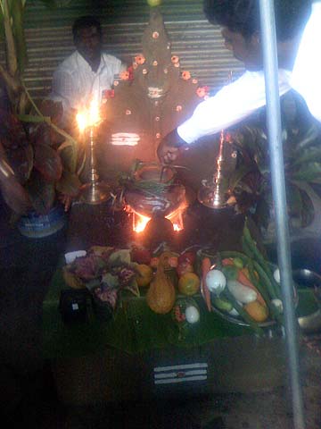 Our silpi team has decorated the pattarai (blacksmith forge) and a pot of rice with milk is already on the fire....