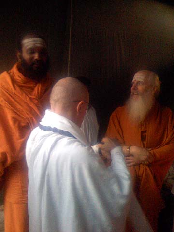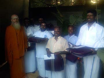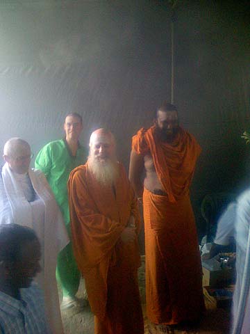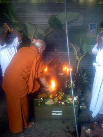 Paramacharya Ceyonswami performs the final arati, giving thanks to the elemental spirits for all of their hard work and energy the past year giving us an abundant harvest of healthy vegetables.
