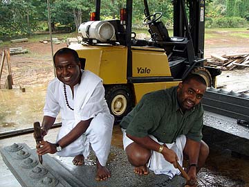 Silpi Kumar and Rishi Thondunatha, who is here visiting on pilgrimage, pose for a "stone-carving" photo.