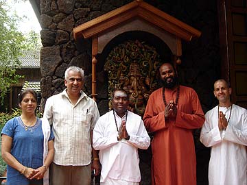 Yoginathaswami poses with guests Drs. Rohini and Reddy Reganti, Rishi Thondunatha and Sadhaka Tejadevanatha outside the Kadavul Siva Temple. In the background is the exqusitely beautiful handcarved Lord Ganesha deity from India. Lord Ganesha rests in a beautiful teakwood shrine made in the Kauai Aadheenam carpentry shop by Kumarswami and Kanda Alahan, one of the devotees.