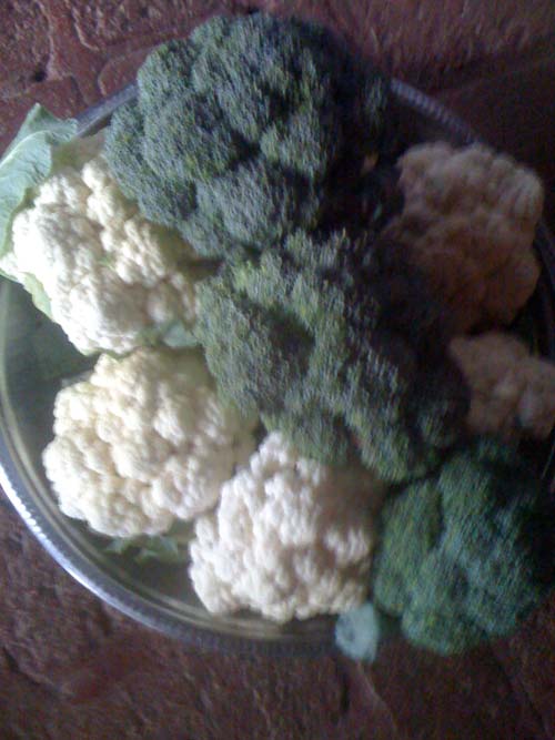 It was a small "victory" for our gardening team to showoff some huge heads of brocolli and cauliflower grown in our own garden. This was done organically, but planted thru a black plastic mulch layer which meant zero weeding was required.