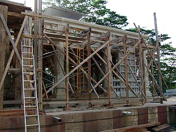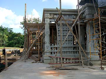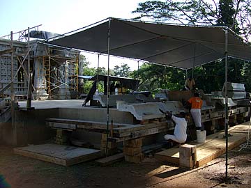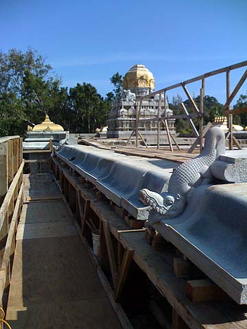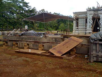 Most of the stones that arrive by container from Bangalore India must wait on site for a while for their final placement. These Kodungai (Sunshade Stones) which form the eves on the outer edge of the roof have been waiting for some time.