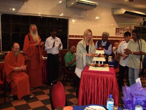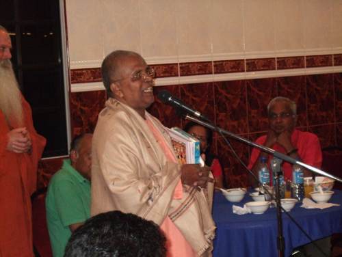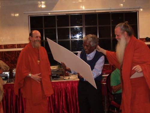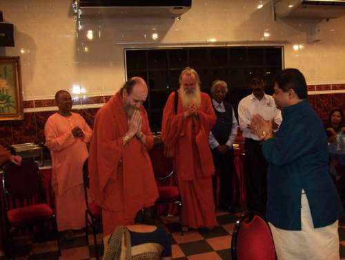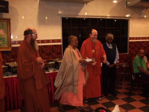 Honoring Swami Guhabhaktananda at a dinner for the Innersearchers sponsored by Dr. Arjunan Subramaniam, pictured to the right of Bodhinatha.