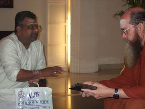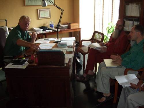 After the Innersearch, Arumugaswami and Saravananathaswami traveled to the French Institute at Pondicherry (now Puducherry). Here they meet with Dr. Jean-Pierre Muller (left), director of the French Institute and Dr. Dominic Goodal, head of the Pondicherry Centre of the French School of the Far East and person in charge of the Institute's vast palm leaf collection.