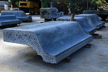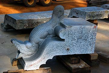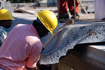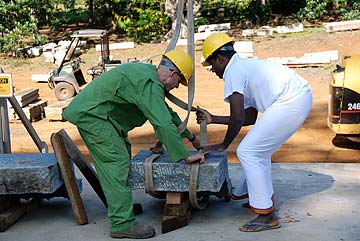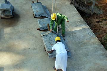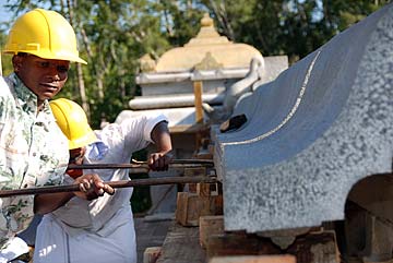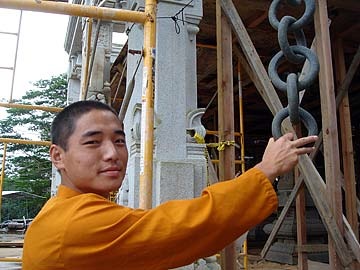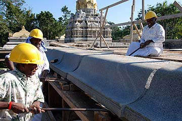 Jamgoen Rinpoche is amazed at the sacred South Indian granite artistry. Here he holds a handcarved blue-black granite chain which hangs on the east side of the Iraivan Temple.