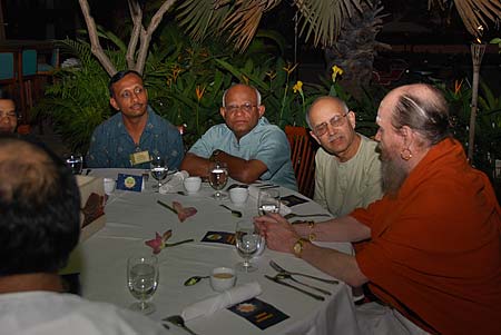 From left, Kulagan (from Mauritius), Vighnarajah (from Australia) and Jai Khanna (from USA) all enjoy the opportunity to sit with Bodhinatha over a meal.