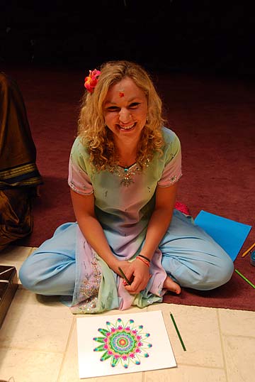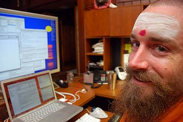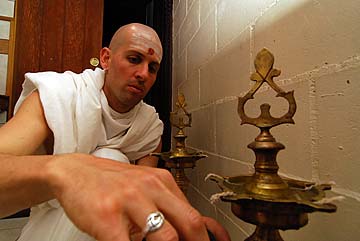 Sadhaka Tejadevanatha hard at work in the back room preparing items for the puja