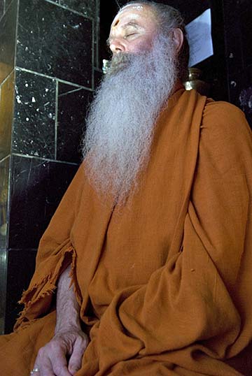 While the group is meditating Shanmuganathaswami is on guard to protect our supplies from monkeys on the island. We already had one bag of chips stolen and swami is determined to make sure nothing else is taken by the island residents.