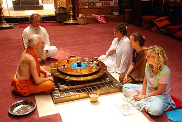 Ceyonswami looks over the astrology of the day with devotees in the temple after the morning puja.