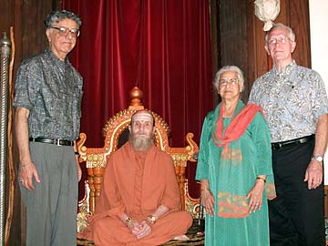 Braj and Yamuna Kachru, accompanied by Larry, the President of Friends of East-West Center in Honolulu, have darshan with Bodhinatha. Braj and Yamuna are visiting scholars at the East West Center, former professors at the University of Illinois at Urbana, and members of a community in Urbana planning to build a temple dedicated to wisdom and culture in the forms of Lord Ganesha and Goddess Saraswati. Bodhinatha will be visiting the community in May on his way to Toronto.
