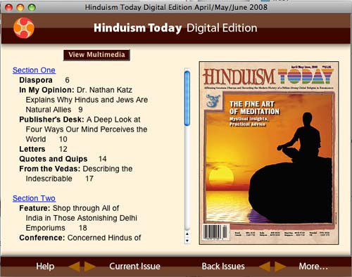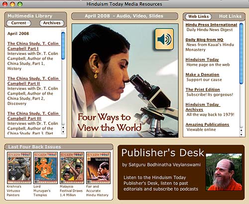 Click on the "View Multimedia" button and you will be presented with our all new Hinduism Today Media Browser. This is a dedicated channel to all the media previous published that is associated with any article in the magazine. Unlike YouTube, the videos are high quality. And you don't have to go digging web pages. It's all here in one place. (You do need an internet connection...) The library is growing with 46 sound files, songs, movies, and audio interviews. Don't miss it!