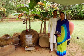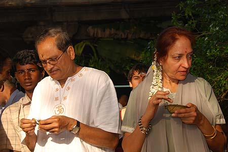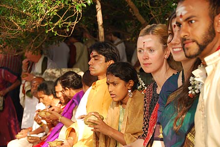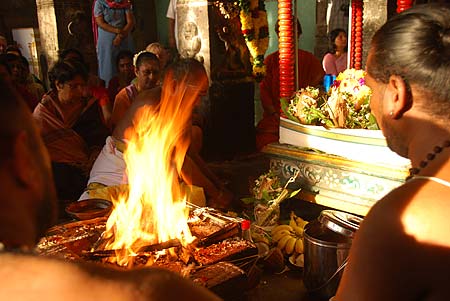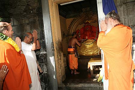 2008 Asian Odyssey: We continue with photos from that special homa held at the Arunachaleswarar temple in Tiruvannamalai on January 25th morning. The group is gathered in a small mandapam and all are absorbed in the powerful vibration.