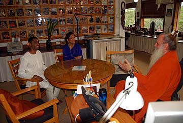 Sadhaka Dandapani coordinates with the group the next event of the day.