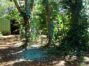 Spring is in the air and the ground is carpeted with beautiful Blue Jade blossoms which are now cascading throughout the trees along the path to the Iraivan Temple.