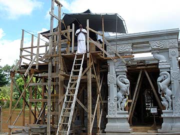 Vellaisamy one of our great artistic silpis, greets our visitors from the temple rooftop where the silpis are busy fitting and sizing shade stones on the Western side of the Iraivan Temple.