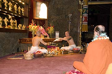 Beside them are Shivaram Kalugotla with his wife Kiran and their two wonderful children Vishnu and Gowri from St. Louis, MO. They also subscribe to Hinduism Today. Both families attended the morning puja, toured the Iraivan Temple, and were then blessed to receive the darshan of Sat Siva Guru Bodhinatha Veylanswami.