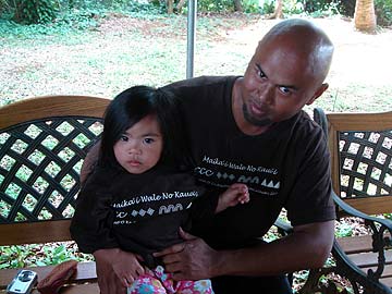 Here is two year old Jessalyn with her dad, too young to perform; she makes up for it as the cheering section for the Hula Halau.