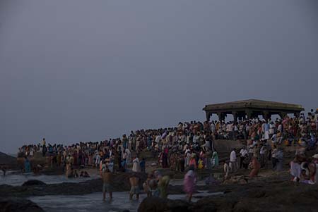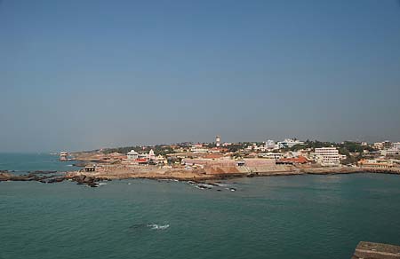 The view of the tip of India. The red and white striped wall is the wall of the Kanyakumari Amman temple.