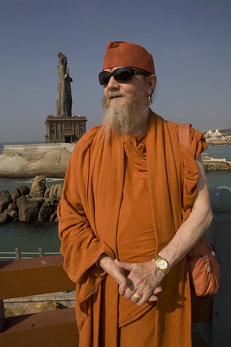 A reflection of the Tiruvalluvar statue is captured in Bodhinatha's sunglasses.
