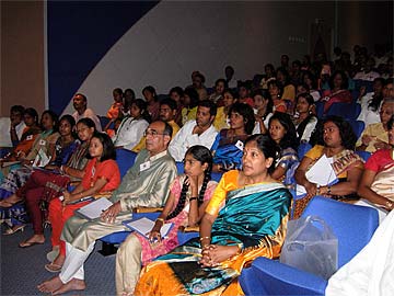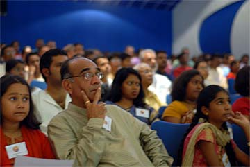 The whole amphitheater is quiet and focussed on what Satguru Bodhinatha is saying.