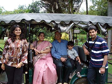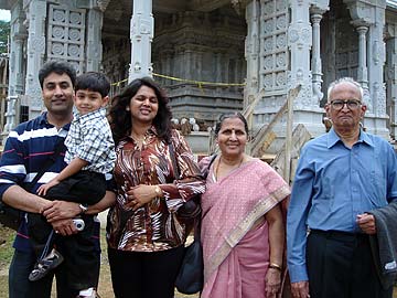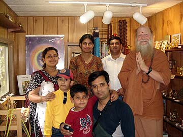On the left is Sudha's daughter, Dr. Yogini Kulkarni-Sharma. On the far right is Rohan Sharma, Yogini's husband, and next to him is their five-year-old very well-behaved little son, Ishaan. Yogini and Rohan met Gurudeva in Singapore in 2001.