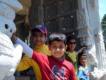 Rolling the ball around in the lion's mouth is fun for these children from families visiting the temple today. Front and center is Parshv age 6; in yellow is Vedant age 6 1/2; In the background is Abinaya age 9 and her brother Amrit age 4.